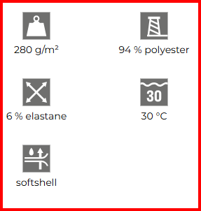 • Softshell: 94 % polyester, 6 % elastane